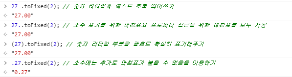 이렇다보니 숫자에 대한 메서드를 사용할때면 이따금 뭔가 이상한 결과를 얻기도 합니다. 아래는 숫자 리터럴에 toFixed() 메소드를 적용한 결과입니다.