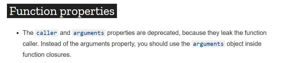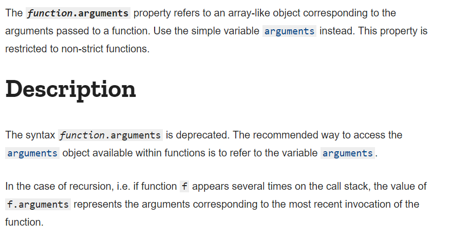 다만 여기서 function.arguments 를 사용해도 작동은 하지만 이 방법은 ES6를 기점으로 Deprecated 되었으니 함수 내의 지역변수인 arguments를 사용해주시면 되겠습니다.