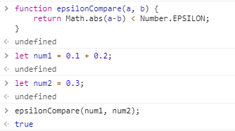이 오류에 대해 그렇게 깊이까지 알 필요는 없지만, 대신 이 숫자를 비교하는 방법은 알아두기로 합시다. 아주 작은 오차에 의해 발생하는 문제이므로, 이를 해결하기 위해 자바스크립트에선 이 오차를 머신 입실론이라는 이름으로 미리 정의해두었습니다.