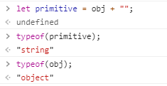 새로 만들어진 primitive 변수에 obj의 값을 함께 더해주는 과정에서 암시적으로 valueOf() 메소드가 사용된 것을 알 수 있습니다. typeof() 로 타입을 확인해보니 primitive는 string임을 알 수 있습니다.