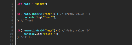 명시적 강제변환을 이야기하는데 뜬금없이 왜 틸드가 나오는지 의아했었지만, 보수를 반환하는 특성 때문에 문자열에서 특정 위치를 검색하는 indexOf() 메소드와 함께 사용하면 강제변환을 통해 불리언 값으로 만들 수 있습니다.