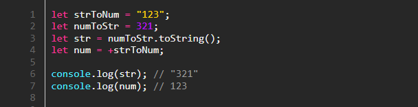 또 다른 명시적인 변환 방법으로는 문자열의 경우 .toString() 을 이용하는 방법, 숫자의 경우 + 연산자를 이용한 방법이 있습니다.