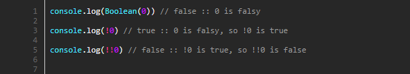 부정 단항 연산자인 ! 도 + 단항 연산자 처럼 값을 불리언 타입으로 변환해줍니다. 다만 변환 과정에서 Truthy와 Falsy 한 값들이 뒤바뀐다는 문제가 있습니다. 따라서 연산자를 이중으로 사용해서 변환 해주는것이 일반적입니다.