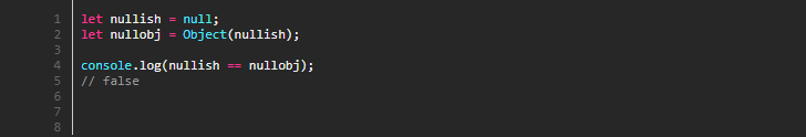 이는 null이 객체 래퍼를 갖고 있지 않아 생기는 문제로 Object()를 통해 박싱되지 않기 때문에 원시값 null과 비교하면 false를 얻게 됩니다. 이는 객체 래퍼를 갖고 있지 않은 undefined도 마찬가지입니다.