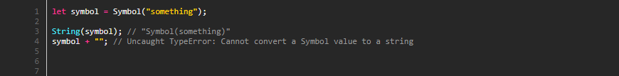 심볼도 강제변환을 가지고 있습니다. 다만 숫자로는 변환이 불가능하고, 문자열은 명시적 변환에 한해서만 가능합니다. 재미있게도 불리언 값으로는 명시적/암시적 구분없이 가능합니다. (모두 true를 반환합니다.) 별로 사용되지는 않지만, 알아두고 넘어갑시다.