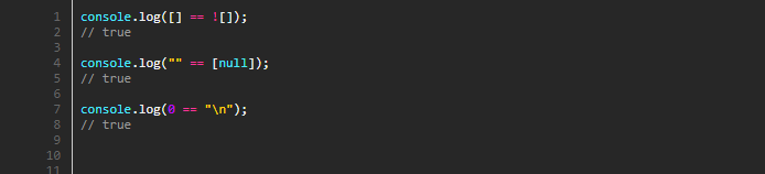 먼저 [] == ![] 를 보면 분명 왼쪽은 truthy한 값이고 오른쪽은 falsy한 값인 것 같은데, 어째서 true가 나오는지 의문스럽습니다. 단순히 보기에도 true == false 처럼 보이는데 어떻게 이런 결과가 나오는걸까요.