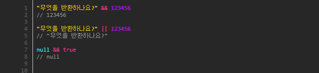 단 하나의 예시도 불리언 값이 아닌 피연산자의 값들을 반환하는 것을 알 수 있습니다. &&과 || 모두 첫 번째 피연산자의 참과 거짓에 따라 반환할 피연산자를 선택합니다.