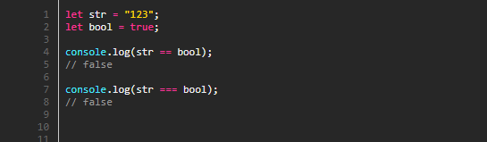 둘의 타입이 다르기 때문에 당연히 일치 비교시에는 false가 출력됩니다. 그런데 동등 비교시에도 false가 나오는건 어째서일까요? 분명 변수 str에 들어있는 비어있지 않은 문자열은 truthy한 값임을 우리는 알고 있는데도요.