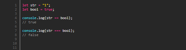 숫자와 문자열을 비교했을때 일치 비교(===)의 경우 타입이 다르기 때문에 false가 출력되고, 동등 비교(==)의 경우 값이 같기 때문에 true를 반환하는 모습입니다.