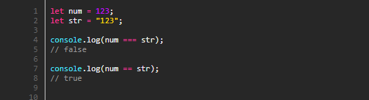 숫자와 문자열을 비교했을때 일치 비교(===)의 경우 타입이 다르기 때문에 false가 출력되고, 동등 비교(==)의 경우 값이 같기 때문에 true를 반환하는 모습입니다.