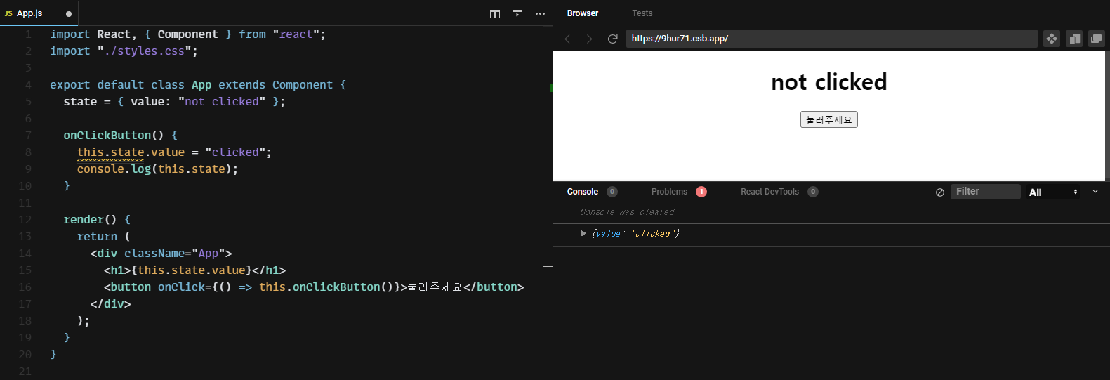 위쪽이 직접 state에 접근하여 변경해주는 경우이고, 아래쪽이 setState를 이용하여 변경해주는 경우입니다. 우리가 예상했던 그대로의 결과를 확인할 수 있습니다.