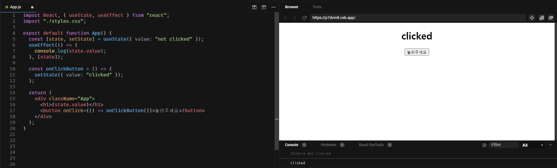 state가 비동기적으로 변경되기 때문에, 콘솔에서는 바뀐 state의 값을 제대로 출력해주지 못했습니다. 그래서 우리는 제대로 된 로그를 위해 state가 변경되면 콘솔창에 로그를 띄워주어야 합니다.