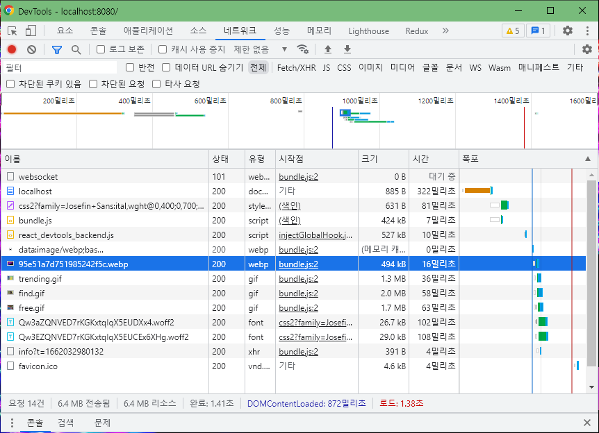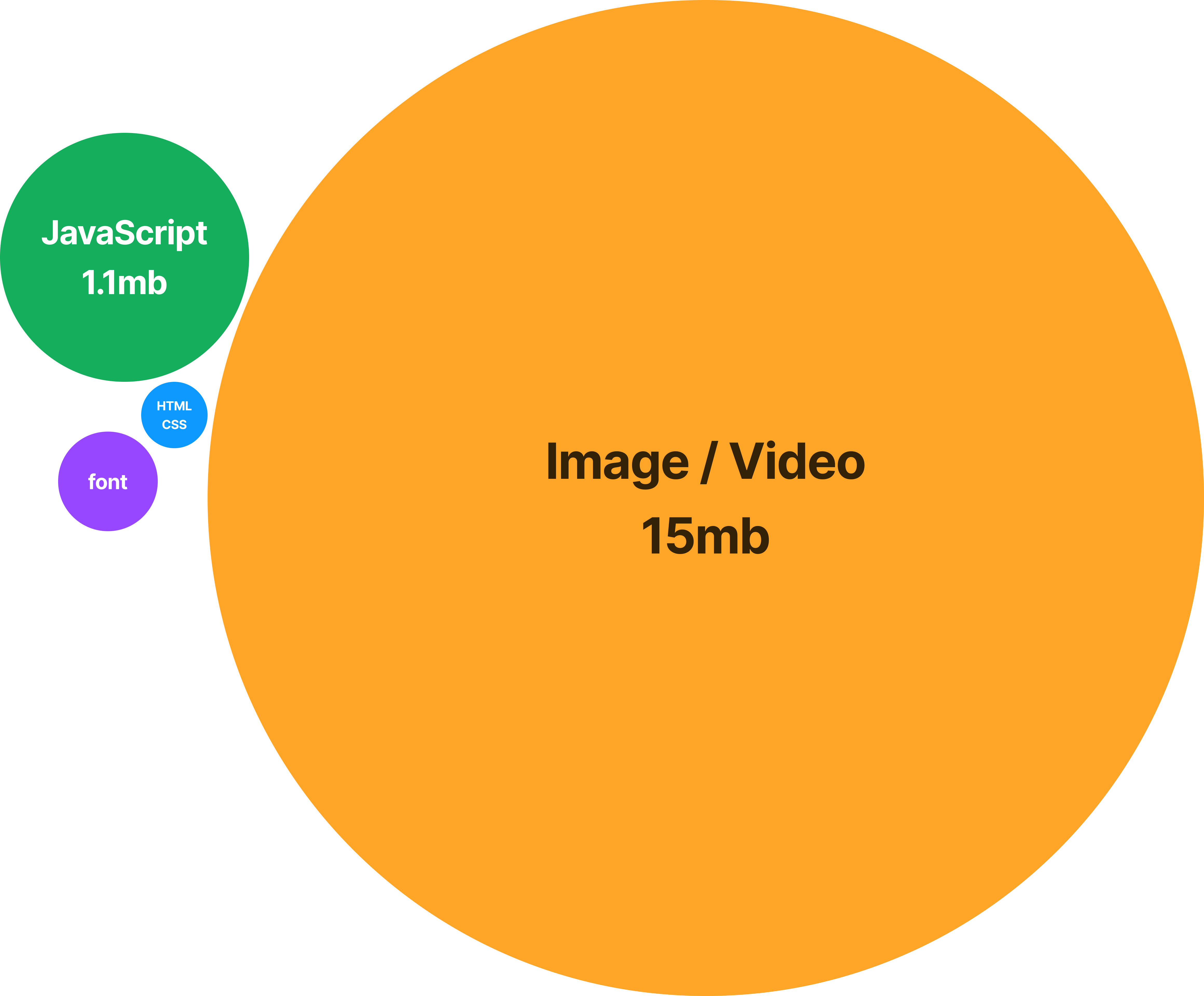 위 그림은 이번에 성능 개선을 진행하던 프로젝트를 기준으로, 네트워크에 요청한 각 파일들이 가진 크기를 형식별로 나누어 그래프로 나타낸 그림입니다. 확실한 비교를 위해 이전 글에서 진행한 자바스크립트 최적화를 적용하지 않은 상태로 비교하였습니다.