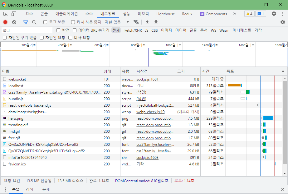 그냥 webp 파일로 변경했을때엔 용량 494kb에 로딩 시간 16밀리초가 된 반면, 압축 퀄리티 지정과 리사이징을 적용해주니 용량 78.8kb에 로딩 시간 10밀리초가 되었습니다. 원본 png 파일이 10mb가 넘어가던걸 생각하면, 극적인 변화가 아닐 수 없습니다. 지난 시간의 js 최적화와는 비교도 되지 않을 정도로 사이트 로딩 속도가 빨라진게 체감이 되었습니다.