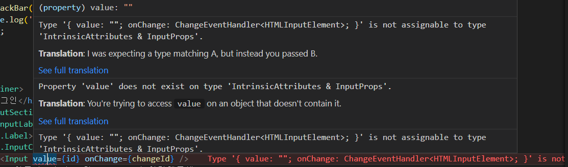 위 사진처럼 원래의 input 태그가 가지고 있어야 할 value 타입 등을 찾을 수 없다고 에러 메시지가 나타나는데, 당연한 결과입니다. 우리가 Props를 넘겨주었던 CustomInput 컴포넌트의 InputProps에는 value가 존재하지 않으니까요.