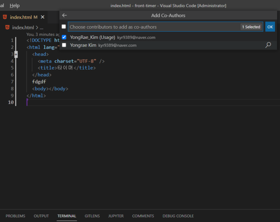 상대방을 추가한 후 아래 메뉴에서 협업자를 적용하면 커밋 이후에도 내용에 해당 협업자가 남아있어 편리하게 커밋을 이어갈 수 있습니다.