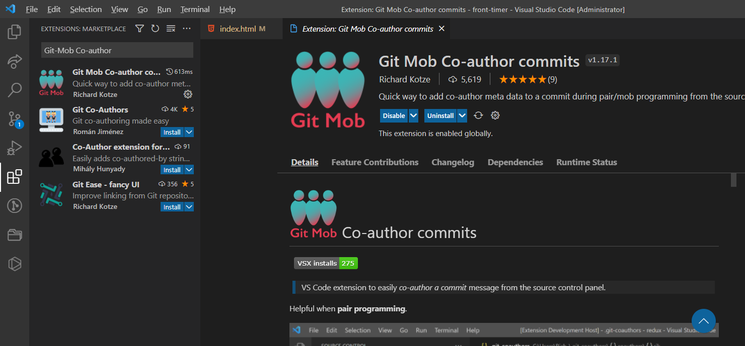 이럴때는 Git Mob Co-author commits 플러그인을 이용하면 편리합니다. Extensions 메뉴에서 Git Mob Co-author commits을 검색하여 설치해줍니다.