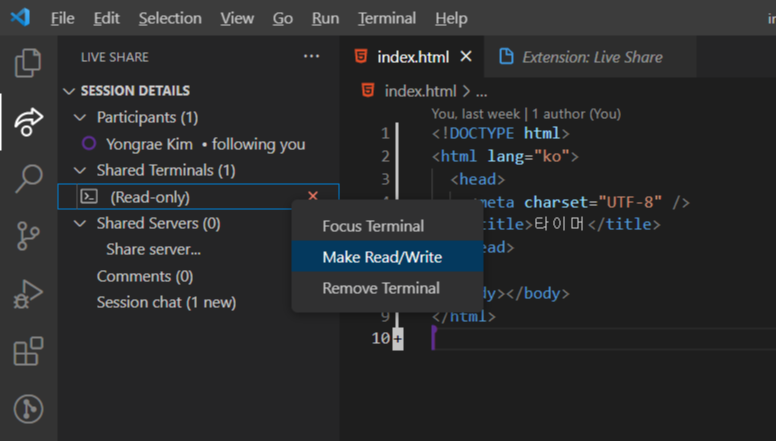 프로젝트에 접속하게 되면 콜라보레이터의 권한은 Read-Only 입니다. 따라서 호스트의 공유 터미널을 사용할 수 없는데, 호스트에게 터미널 권한 변경을 요청해야 합니다. 호스트의 경우 아래처럼 터미널의 권한을 변경할 수 있습니다.