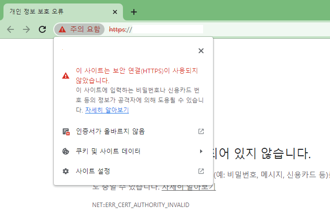 이때 주소창 부분의 "주의 요함" 을 클릭해서 확인해보면, 이런 팝업이 표시됩니다.