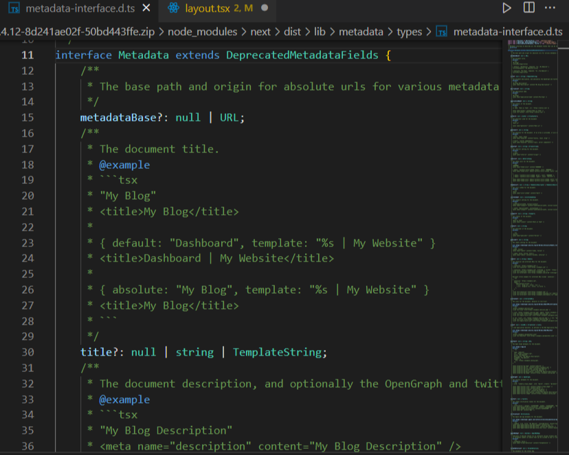 metadata 변수는 next에 선언되어있는 Metadata 라는 타입을 가지며, 해당 타입이 선언된 d.ts 파일에 가보면 자세한 설명과 함께 용법을 제공합니다. 공식 문서의 가이드 없이 타입 선언만 참고해도 충분할 정도로 상세하게 안내하고 있습니다.