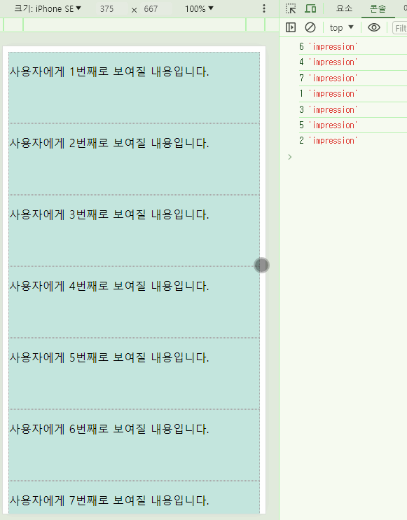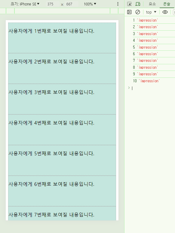 우리가 의도한대로, 스크롤을 내려 요소가 사용자에게 노출되는 순간 로그가 찍히는 모습입니다.