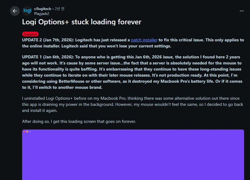 Logi Options+ 사용자라면: 링크에서 패치 전용 설치 프로그램을 다운로드하여 실행하기만 하면 됩니다. 설치 프로그램이 구동된 후 자동으로 종료되면서, 잠시 후 Options+ 앱이 정상적으로 다시 열리는 것을 볼 수 있습니다.