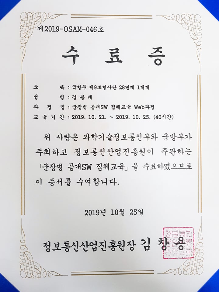 지난 군인이 된 컴공이 사는 법 포스팅에서 국방부오픈소스아카데미 (osam.kr) 인터넷 강좌를 듣고 있다고 잠깐 적었었는데 온라인 성적 우수자에게 제공하는 집체교육에 선발되었습니다.