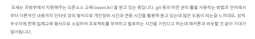 국방부오픈소스아카데미 라는 온라인 강좌가 있다는 것을 알게되어 듣기 시작했다. 마침 Web과정도 진행중이기에 바로 수강을 시작했는데 부족한 기초를 튼튼하게 다져주는데 톡톡한 역할을 해주었다. 강좌를 촬영할 당시가 지금과 시간적으로 차이가 나서 상대적으로 예전에 사용하던 테크닉(?)들이 많이 들어가있다는 의견들이 꽤 있었지만 그거야 어느정도 수준에 오른 개발자들에게나 통용되는 이야기이고, 나처럼 주먹구구식으로 그때 그때 찾아서 코딩하던 사람에겐 커리큘럼이 짜여진 강의는 가뭄의 단비같은 존재였다.