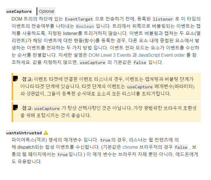 addEventListener의 구문을 보시면 type과 listener 말고도 options와 useCapture, wantsUntrusted 등 다양한 매개변수가 더 있는 것을 알 수 있습니다. 이 중 wantsUntrusted는 리스너를 시스템 그룹에 추가할지 묻는 불리언 타입의 매개 변수인데 실행되는 브라우저 환경이 정해져있는 비표준이기에 주의가 필요합니다.