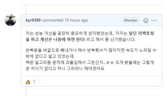 어디까지나 리팩토링은 시간을 아껴주는 효율적인 도구일 뿐 그 자체가 목적이 되어서는 안된다는 점을 기억해야 할 것 같습니다.