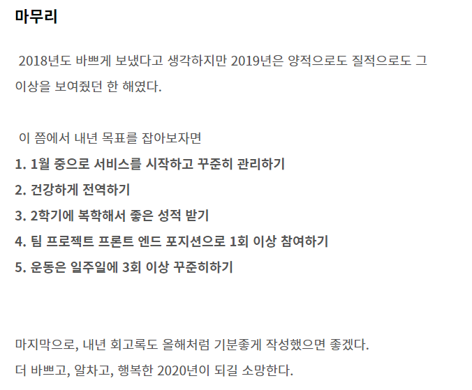 작년보다 바빠진 한 해를 보냈다. 사실 전역을 한 이상 그렇지 않기가 더 어렵긴 하지만... 올해는 운동도 꾸준히 하고, 알고리즘 공부도 하고, 프론트 엔드로서도 스스로 만족할만한 지식 수준을 가진 상태였으면 좋겠다.