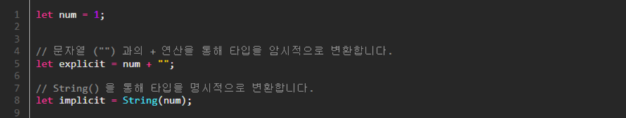 이렇듯 암시적인 변환을 이해하기 위해서는 값의 타입이 어떻게 결정되는지 알아야 할 필요가 있습니다. 더하기(+) 연산자를 통해 문자열을 피연산자로 받았을 경우 문자열 타입이 된다는 사실을 모른다면 위의 예시에서 변수 explicit 가 어째서 문자열이 되는지 알 수 없었을 것입니다.