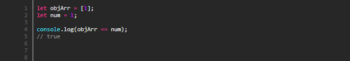 objArr과 num과의 비교가 일어나면 배열(객체) 안쪽의 값을 추출(변환)하여 1이라는 원시 값을 확보하고, 이를 1의 값을 가지고 있는 변수 num과 비교하여 true를 반환하게됩니다.